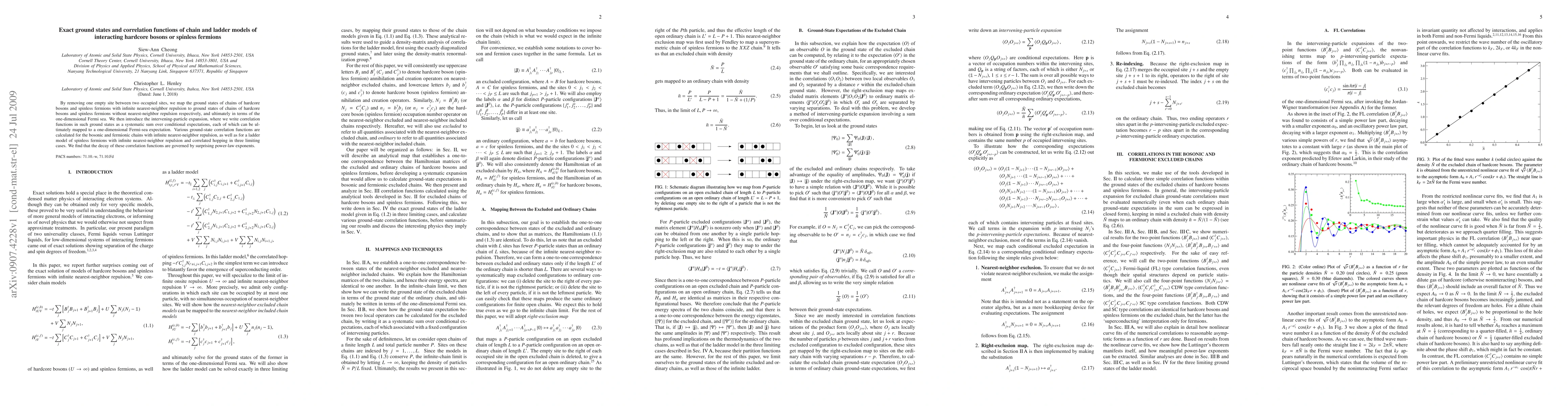 This paper maps the ground states of interacting hardcore bosons and spinless fermions with infinite nearest-neighbor repulsion to simpler states using an intervening-particle expansion, revealing surprising power-law decay in correlation functions for various chains and ladder models.