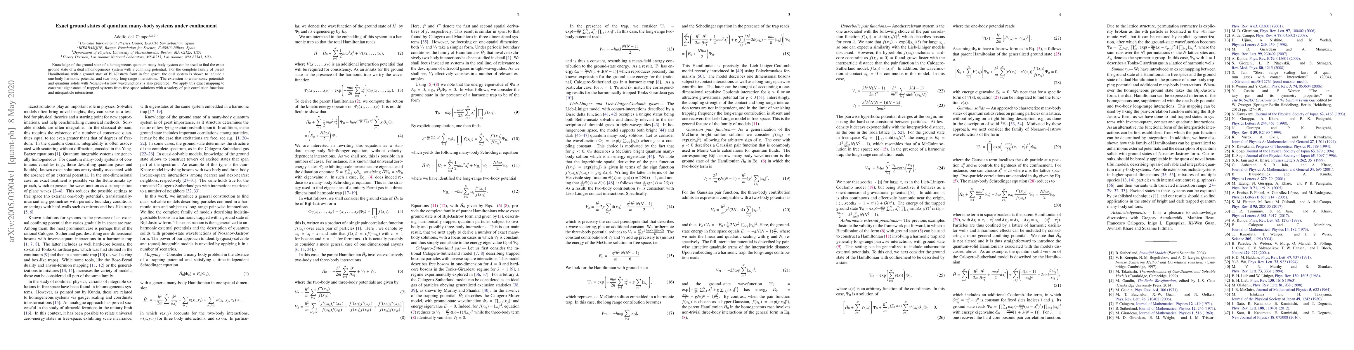 Researchers developed a method to map exact ground states of free-space quantum many-body systems to confined systems with harmonic potentials and long-range interactions. This allows for the creation of eigenstates of trapped systems from known free-space solutions.