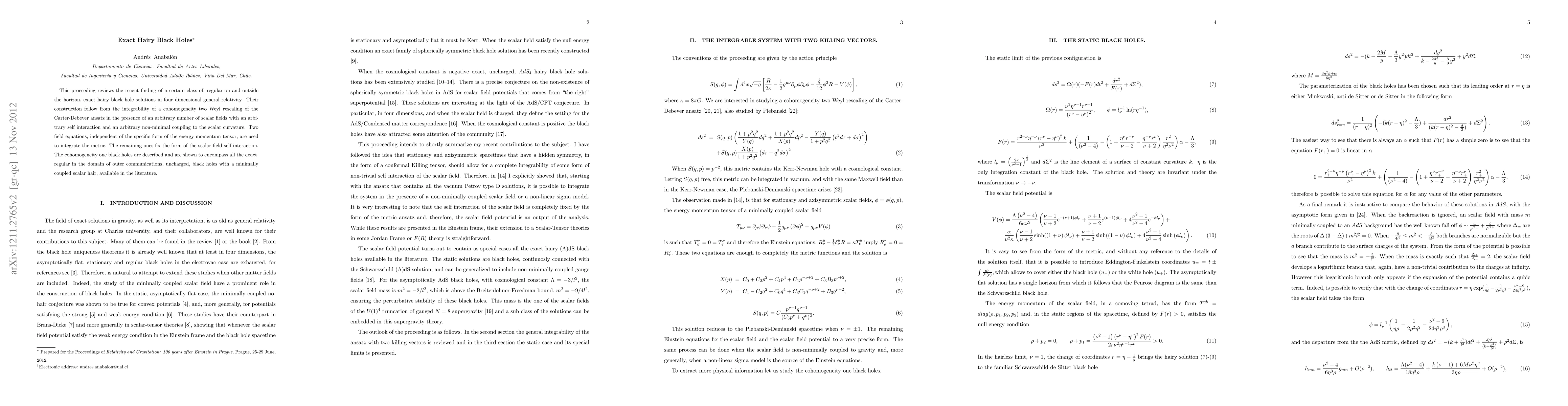 This proceeding reviews the recent finding of a certain class of, regular on and outside the horizon, exact hairy black hole solutions in four dimensional general relativity. Their construction follow from the integrability of a cohomogeneity two Weyl rescaling of the Carter-Debever ansatz in the presence of an arbitrary number of scalar fields with an arbitrary self interaction and an arbitrary non-minimal coupling to the scalar curvature. Two field equations, independent of the specific form of the energy momentum tensor, are used to integrate the metric. The remaining ones fix the form of the scalar field self interaction. The cohomogeneity one black holes are described and are shown to encompass all the exact, regular in the domain of outer communications, uncharged, black holes with a minimally coupled scalar hair, available in the literature.