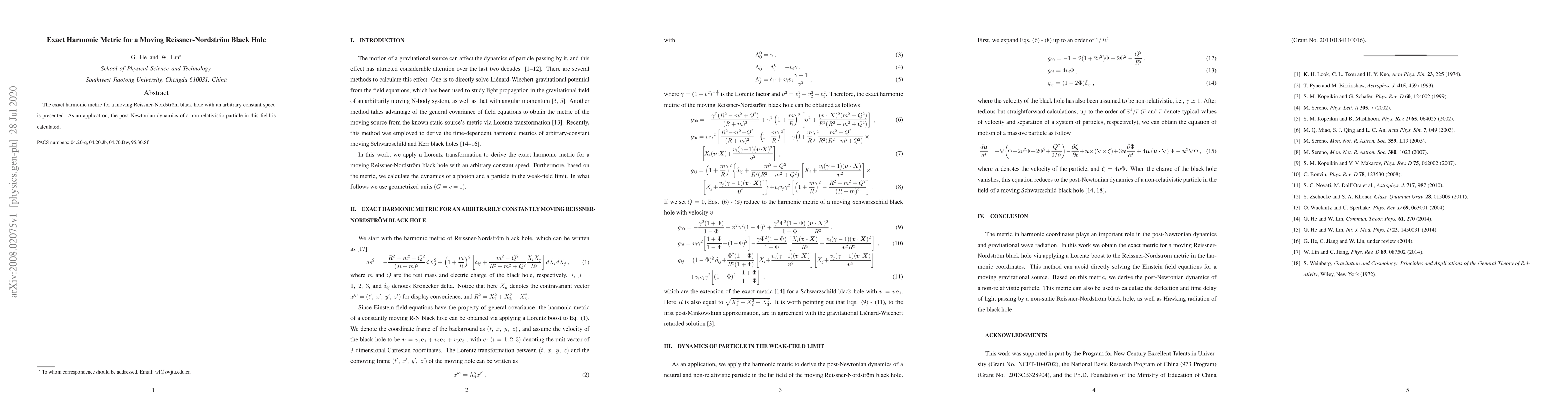 Researchers have created an exact harmonic metric for a moving Reissner-Nordstr"om black hole, enabling the calculation of post-Newtonian dynamics for particles in its field.