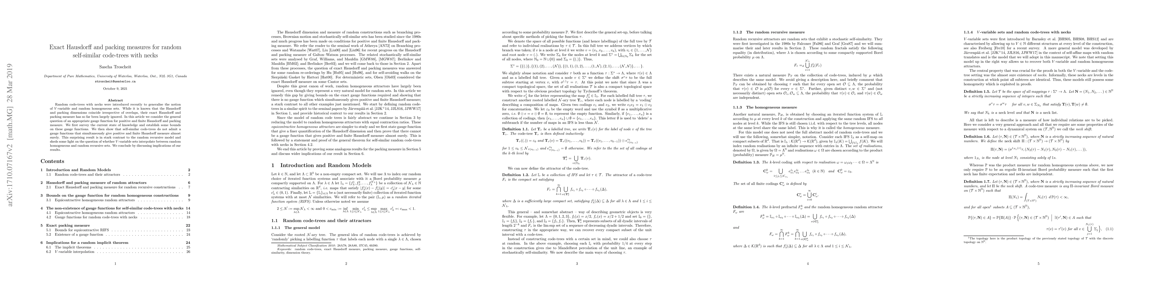 This paper investigates the Hausdorff and packing measures for random self-similar code-trees with necks, revealing that these trees do not support gauge functions that yield positive and finite measures almost surely, contrasting with the random recursive model. The findings provide insights into the nature of $V$-variable sets.
