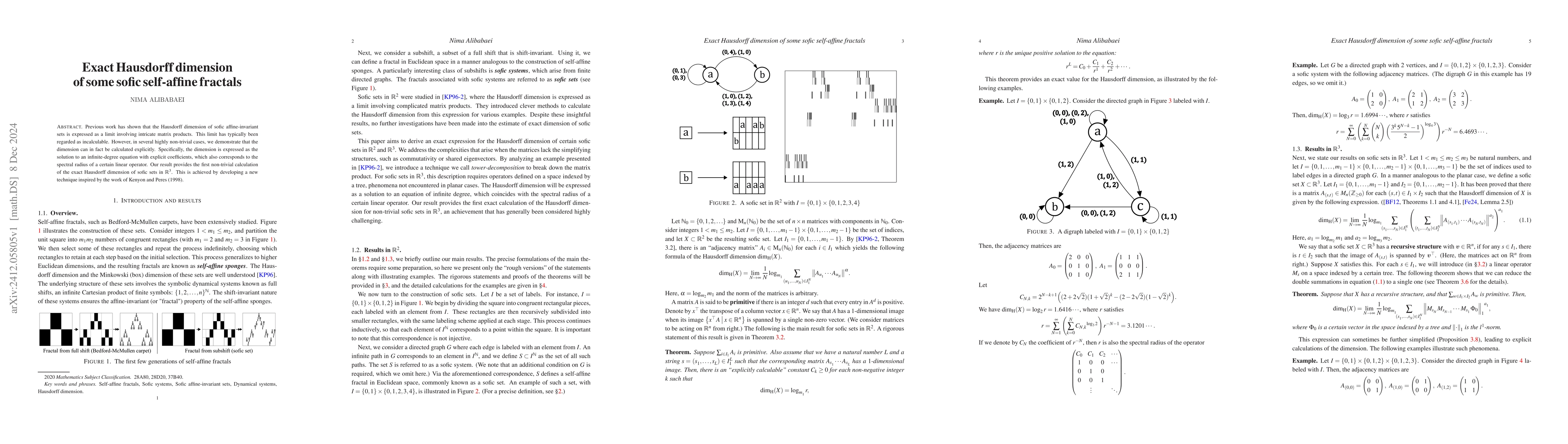 This paper tackles the challenge of calculating the Hausdorff dimension for specific sofic self-affine fractals, previously deemed incalculable. By employing a novel method inspired by Kenyon and Peres (1998), the authors derive an exact dimension expressed as the solution to an infinite-degree equation, marking the first explicit calculation for sofic sets in $\mathbb{R}^3$.