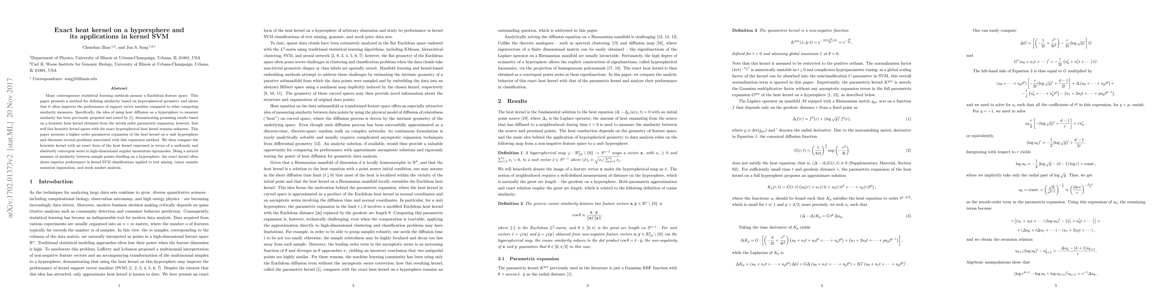 This paper develops an exact heat kernel on a hypersphere and compares it to a heuristic kernel, demonstrating that the exact kernel often enhances the performance of kernel SVM in various applications like text mining and stock market analysis. The exact kernel, derived from a higher-order parametrix expansion, shows superior classification results compared to competing similarity measures.