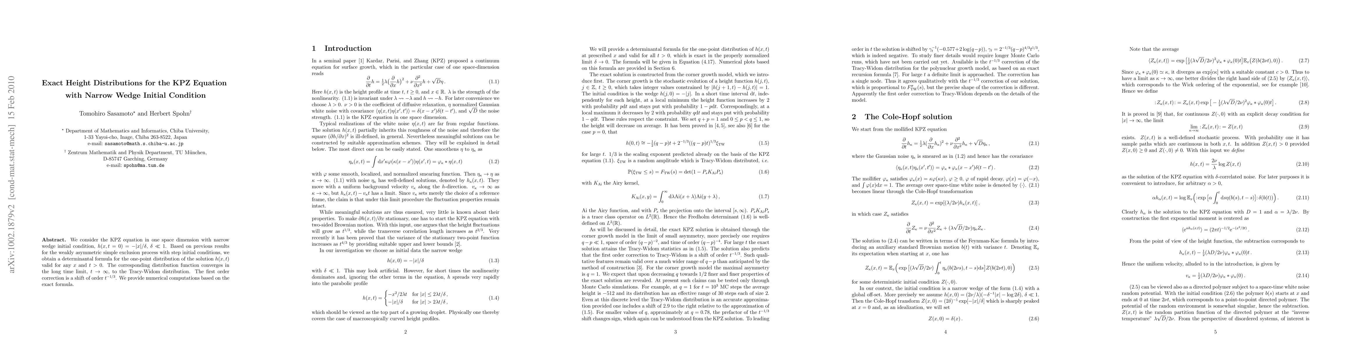 This paper derives a determinantal formula for the height distribution of the KPZ equation with narrow wedge initial conditions, showing that it converges to the Tracy-Widom distribution with a first-order correction of order $t^{-1/3}$ in the long time limit. Numerical computations validate the derived formula.