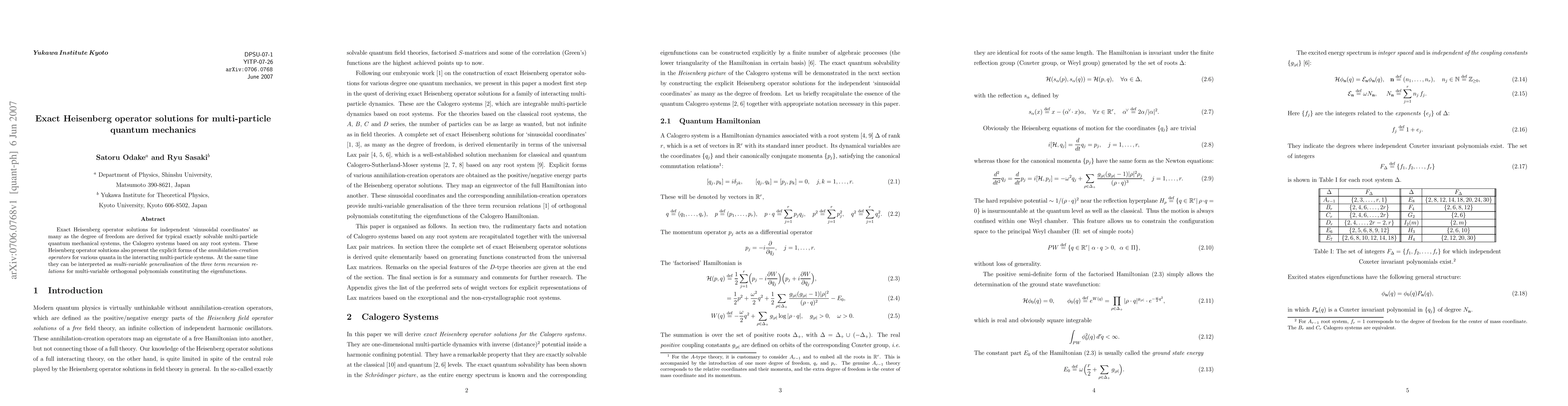 Exact Heisenberg operator solutions for independent `sinusoidal coordinates' as many as the degree of freedom are derived for typical exactly solvable multi-particle quantum mechanical systems, the Calogero systems based on any root system. These Heisenberg operator solutions also present the explicit forms of the annihilation-creation operators for various quanta in the interacting multi-particle systems. At the same time they can be interpreted as multi-variable generalisation of the three term recursion relations for multi-variable orthogonal polynomials constituting the eigenfunctions.