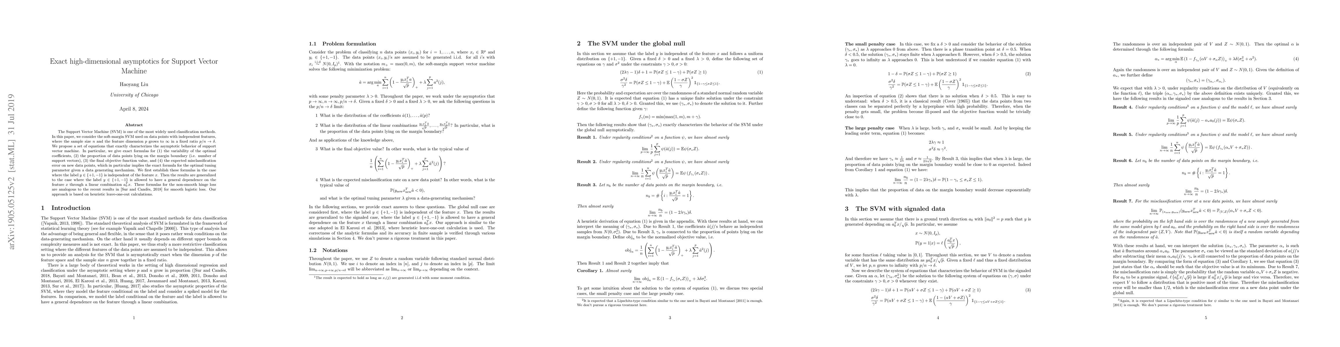 The paper presents exact asymptotic formulas for SVM behavior in high-dimensional settings, generalizing previous findings for smooth losses to non-smooth hinge loss.