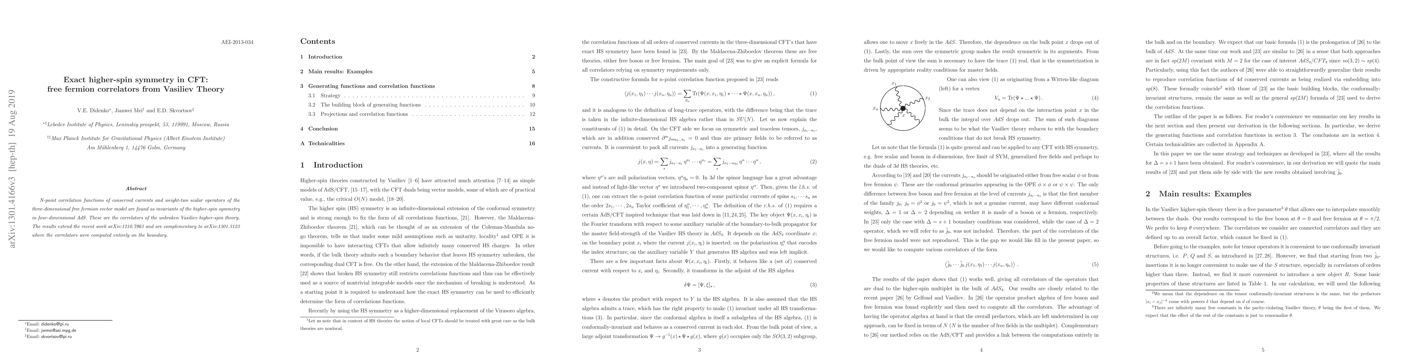 N-point correlation functions of conserved currents and weight-two scalar operators of the three-dimensional free fermion vector model are found as invariants of the higher-spin symmetry in four-dimensional AdS. These are the correlators of the unbroken Vasiliev higher-spin theory. The results extend the recent work arXiv:1210.7963 and are complementary to arXiv:1301.3123 where the correlators were computed entirely on the boundary.
