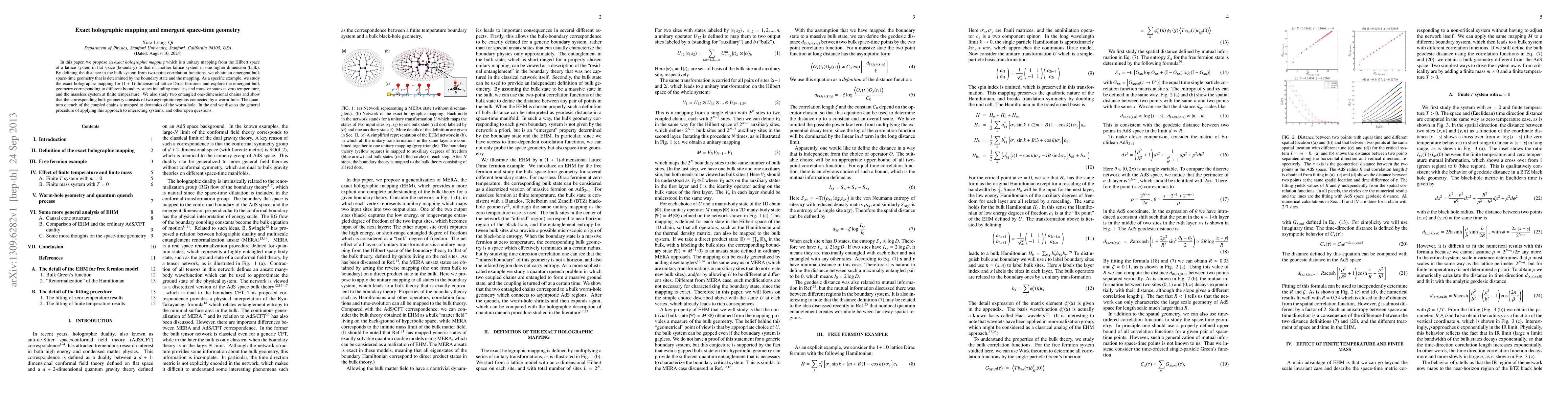 In this paper, we propose an {\it exact holographic mapping} which is a unitary mapping from the Hilbert space of a lattice system in flat space (boundary) to that of another lattice system in one higher dimension (bulk). By defining the distance in the bulk system from two-point correlation functions, we obtain an emergent bulk space-time geometry that is determined by the boundary state and the mapping. As a specific example, we study the exact holographic mapping for $(1+1)$-dimensional lattice Dirac fermions and explore the emergent bulk geometry corresponding to different boundary states including massless and massive states at zero temperature, and the massless system at finite temperature. We also study two entangled one-dimensional chains and show that the corresponding bulk geometry consists of two asymptotic regions connected by a worm-hole. The quantum quench of the coupled chains is mapped to dynamics of the worm-hole. In the end we discuss the general procedure of applying this approach to interacting systems, and other open questions.