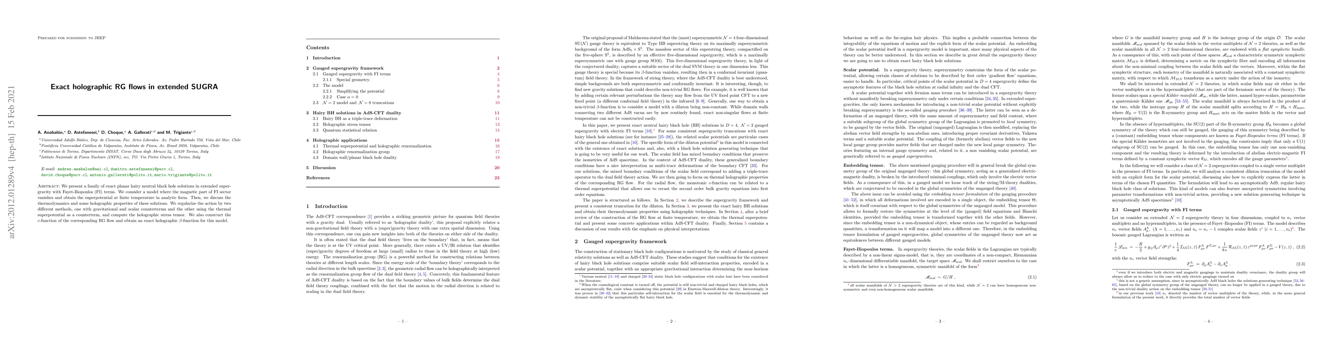 This paper presents exact planar hairy neutral black hole solutions in extended supergravity with Fayet-Iliopoulos terms, analyzes their thermodynamics, and computes holographic quantities including the holographic stress tensor and an exact holographic $\beta$-function for the corresponding RG flow. Two regularization methods are employed to derive these results.