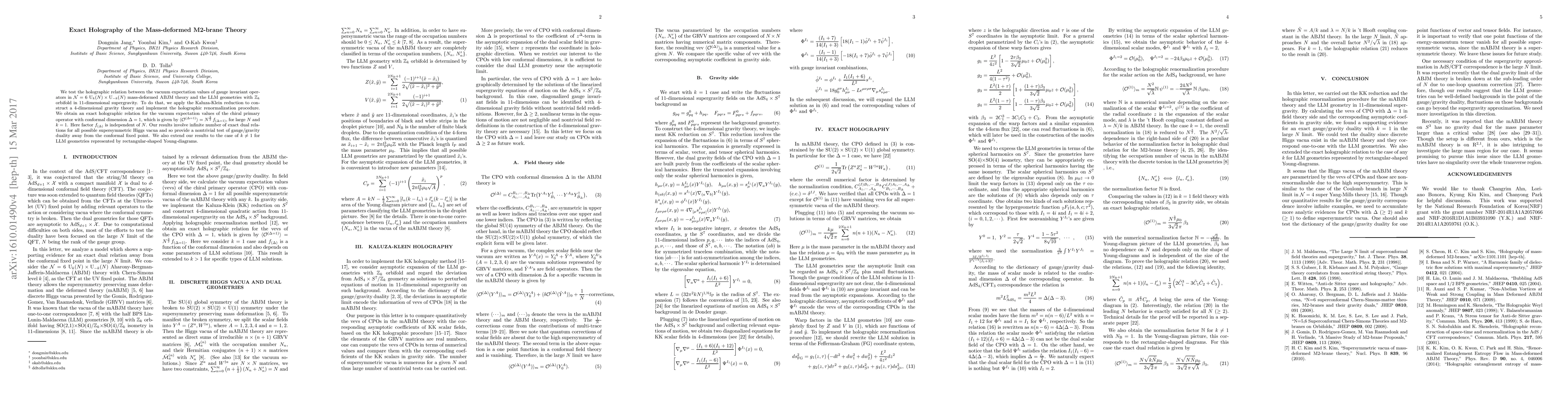 We test the holographic relation between the vacuum expectation values of gauge invariant operators in ${\cal N} = 6$ ${\rm U}_k(N)\times {\rm U}_{-k}(N)$ mass-deformed ABJM theory and the LLM geometries with $\mathbb{Z}_k$ orbifold in 11-dimensional supergravity. To do that, we apply the Kaluza-Klein reduction to construct a 4-dimensional gravity theory and implement the holographic renormalization procedure. We obtain an exact holographic relation for the vacuum expectation values of the chiral primary operator with conformal dimension $\Delta = 1$, which is given by $\langle {\cal O}^{(\Delta=1)}\rangle= N^{\frac32} \, f_{(\Delta=1)}$, for large $N$ and $k=1$. Here factor $f_{(\Delta)}$ is independent of $N$. Our results involve infinite number of exact dual relations for all possible supersymmetric Higgs vacua and so provide a nontrivial test of gauge/gravity duality away from the conformal fixed point. We also extend our results to the case of $k\ne 1$ for LLM geometries represented by rectangular-shaped Young-diagrams.