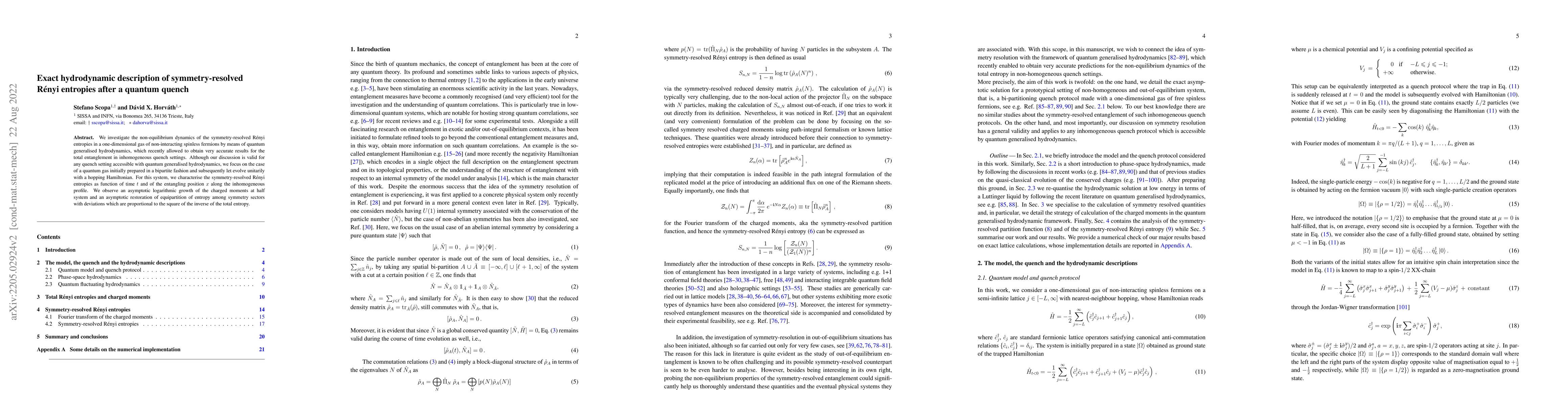 This paper uses quantum generalised hydrodynamics to study the non-equilibrium dynamics of symmetry-resolved R\'enyi entropies in a one-dimensional gas of non-interacting spinless fermions after a quantum quench. It reveals an asymptotic logarithmic growth of charged moments and an eventual restoration of entropy equipartition among symmetry sectors.