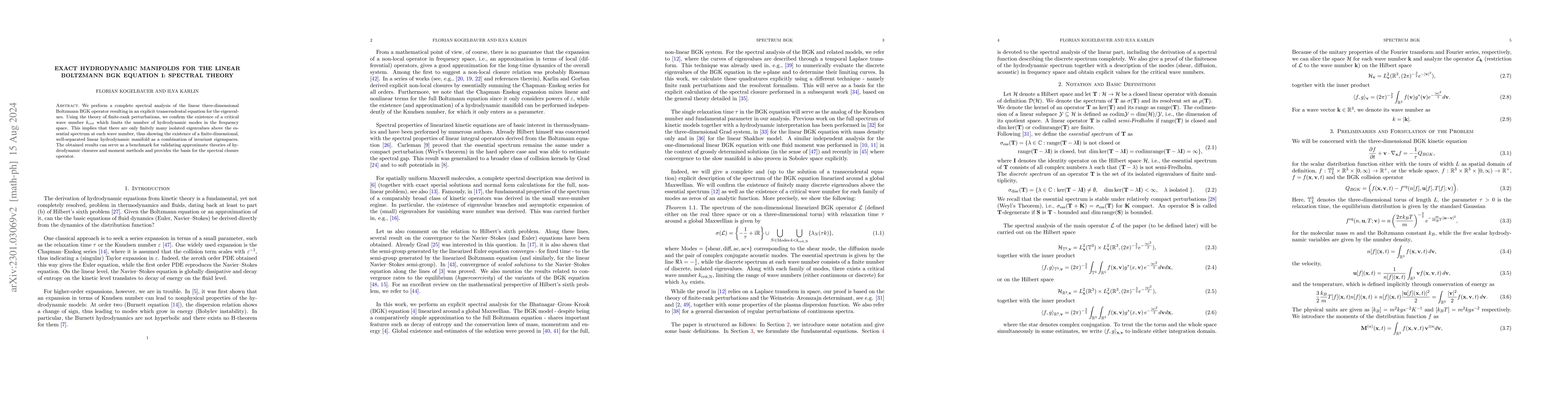 The paper presents a detailed spectral analysis of the linearized three-dimensional Boltzmann BGK operator, leading to an explicit transcendental equation for eigenvalues and proving the existence of a critical wave number that separates hydrodynamic modes from the continuous spectrum.
