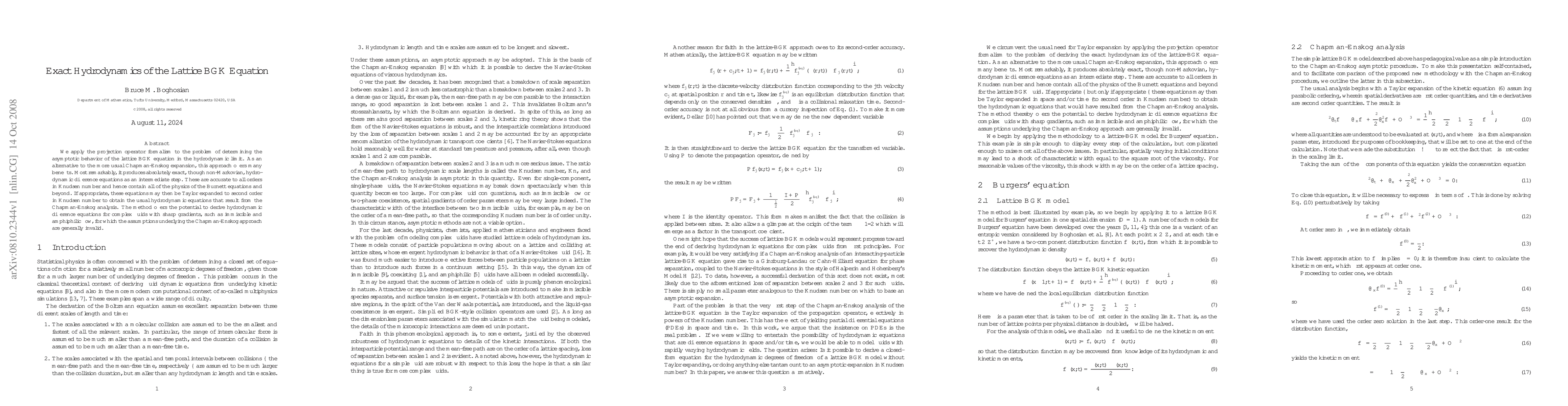 We apply the projection operator formalism to the problem of determining the asymptotic behavior of the lattice BGK equation in the hydrodynamic limit. As an alternative to the more usual Chapman-Enskog expansion, this approach offers many benefits. Most remarkably, it produces absolutely exact, though non-Markovian, hydrodynamic difference equations as an intermediate step. These are accurate to all orders in Knudsen number and hence contain all of the physics of the Burnett equations and beyond. If appropriate, these equations may then be Taylor expanded to second order in Knudsen number to obtain the usual hydrodynamic equations that result from the Chapman-Enskog analysis. The method offers the potential to derive hydrodynamic difference equations for complex fluids with sharp gradients, such as immiscible and amphiphilic flow, for which the assumptions underlying the Chapman-Enskog approach are generally invalid.