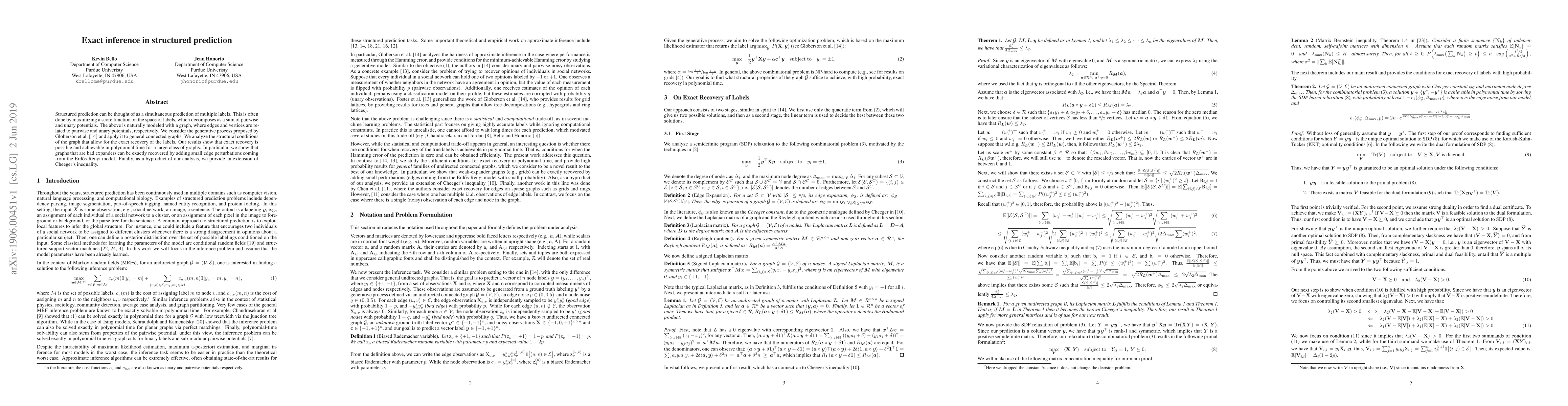 This paper explores exact inference in structured prediction on connected graphs, demonstrating that exact recovery of labels is feasible under certain structural conditions and can be achieved in polynomial time. It also shows that small edge perturbations can enable exact recovery in graphs that are poor expanders, along with an extension of Cheeger's inequality as a result.