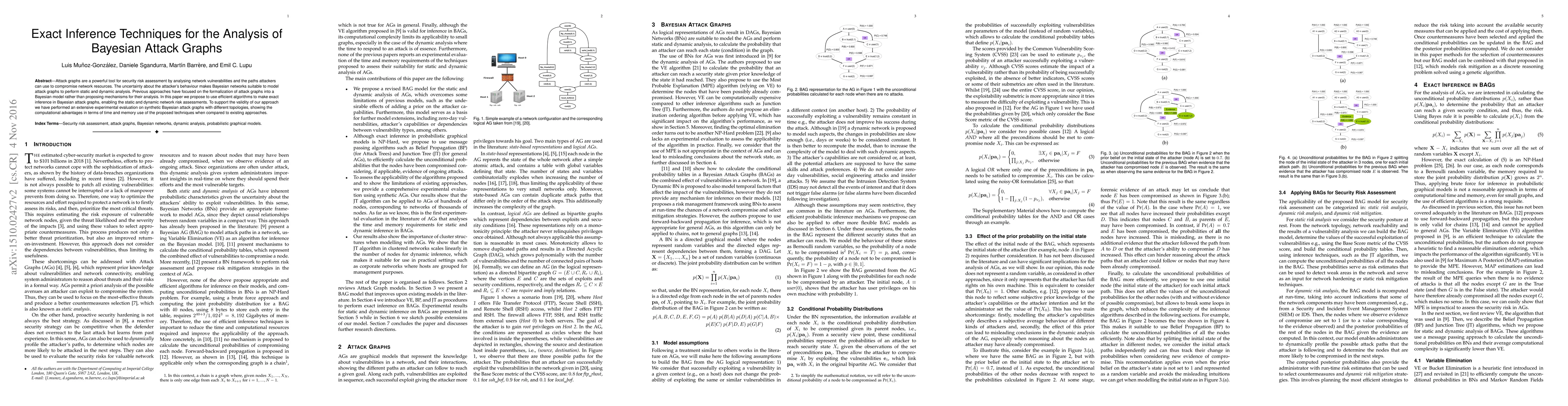 This paper proposes efficient exact inference algorithms for Bayesian attack graphs, enabling improved static and dynamic network risk assessments. Experimental evaluations demonstrate significant computational advantages over existing methods in terms of time and memory efficiency.