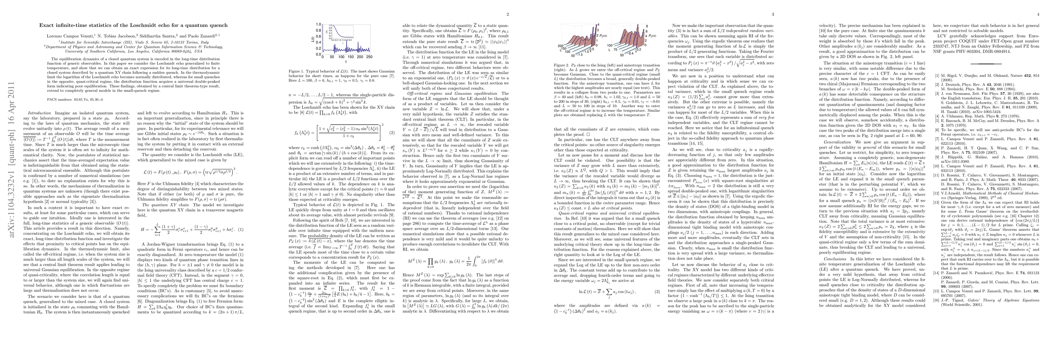 The equilibration dynamics of a closed quantum system is encoded in the long-time distribution function of generic observables. In this paper we consider the Loschmidt echo generalized to finite temperature, and show that we can obtain an exact expression for its long-time distribution for a closed system described by a quantum XY chain following a sudden quench. In the thermodynamic limit the logarithm of the Loschmidt echo becomes normally distributed, whereas for small quenches in the opposite, quasi-critical regime, the distribution function acquires a universal double-peaked form indicating poor equilibration. These findings, obtained by a central limit theorem-type result, extend to completely general models in the small-quench regime.