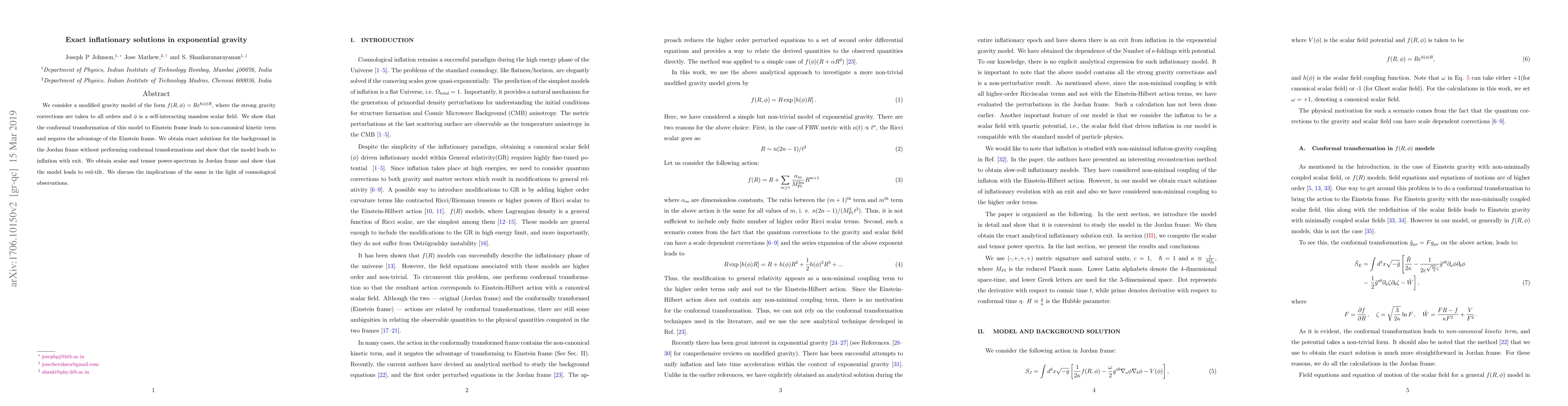We consider a modified gravity model of the form $ f(R,\phi)=R e^{h(\phi)R} $, where the strong gravity corrections are taken to all orders and $\phi$ is a self-interacting massless scalar field. We show that the conformal transformation of this model to Einstein frame leads to non-canonical kinetic term and negates the advantage of the Einstein frame. We obtain exact solutions for the background in the Jordan frame without performing conformal transformations and show that the model leads to inflation with exit. We obtain scalar and tensor power-spectrum in Jordan frame and show that the model leads to red-tilt. We discuss the implications of the same in the light of cosmological observations.