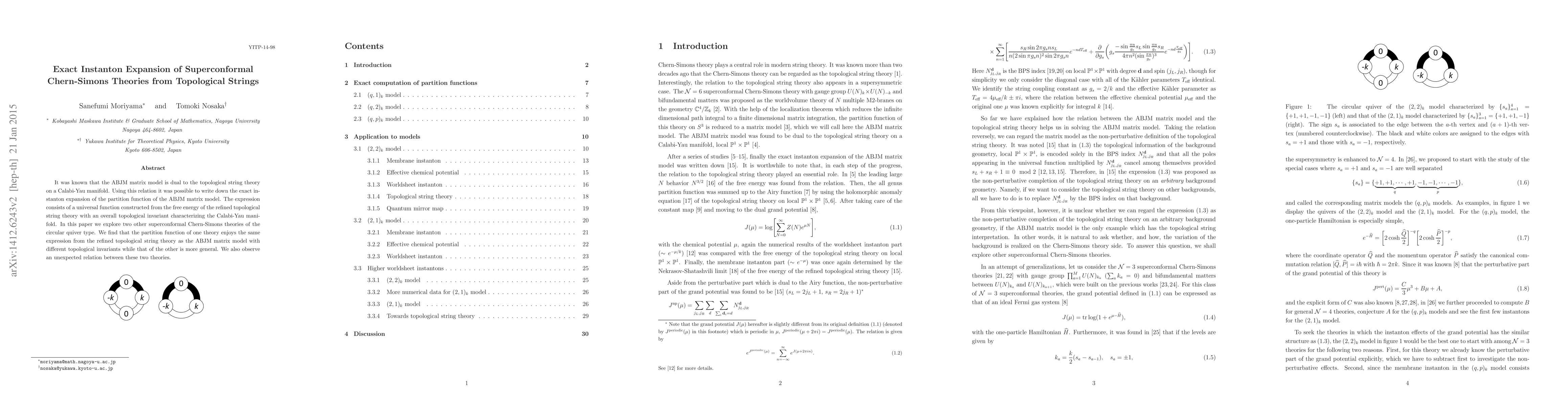 Summary: This paper explores the exact instanton expansion of two superconformal Chern-Simons theories via topological strings, revealing an expression for the partition function linked to the refined topological string theory. One theory shares a similar instanton expansion as the ABJM model with distinct topological invariants, while the other exhibits a more generalized expression, along with an unexpected relation between the two.