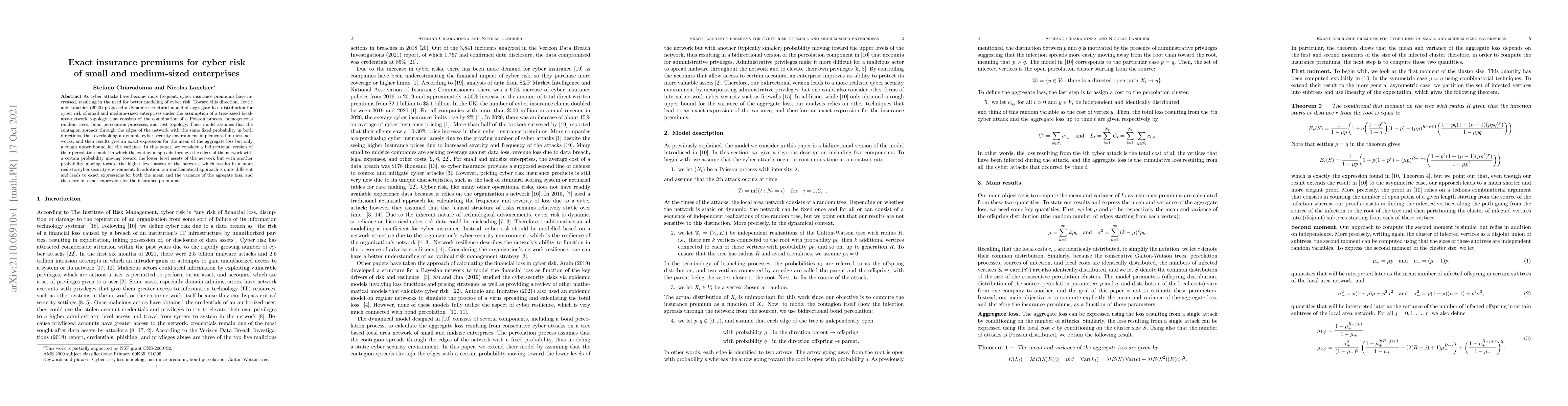This paper proposes a bidirectional percolation model for cyber risk in small and medium-sized enterprises, improving upon previous models by accounting for dynamic cyber security environments. It provides exact expressions for both the mean and variance of aggregate loss, leading to precise insurance premium calculations.