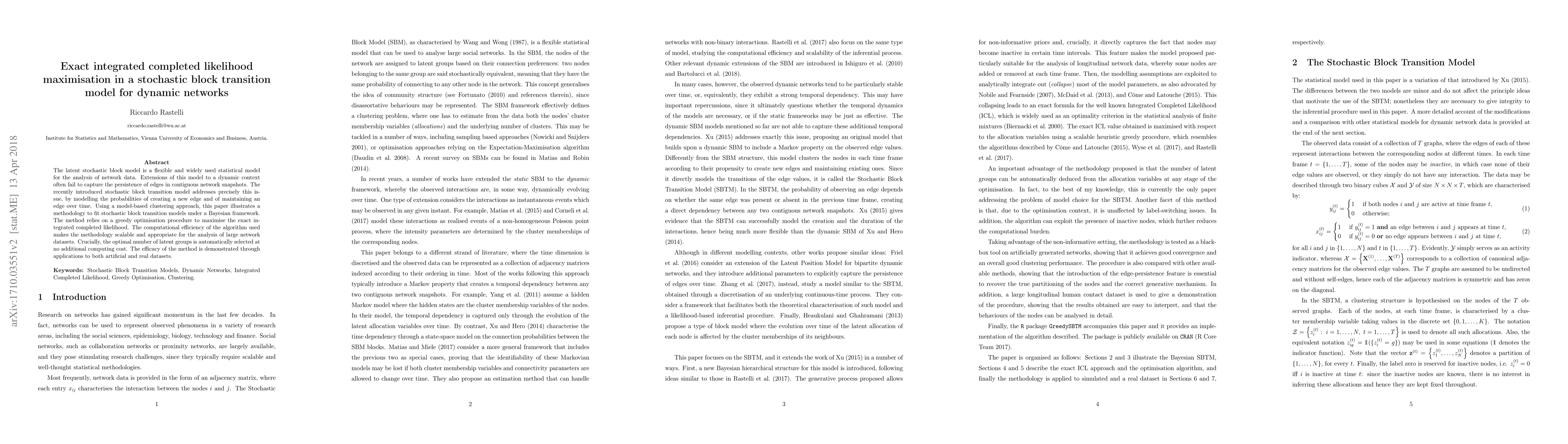 This paper proposes a Bayesian methodology for fitting stochastic block transition models to dynamic networks, using exact integrated completed likelihood maximisation. The method efficiently determines the optimal number of latent groups without extra computational cost, demonstrating scalability and efficacy on both artificial and real datasets.