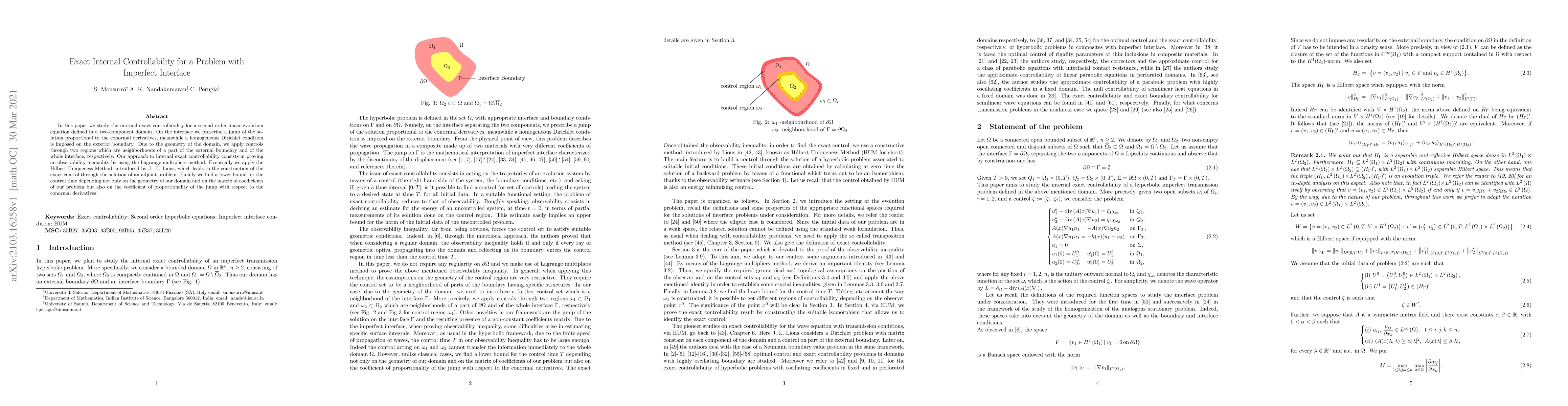 In this paper we study the internal exact controllability for a second order linear evolution equation defined in a two-component domain. On the interface we prescribe a jump of the solution proportional to the conormal derivatives, meanwhile a homogeneous Dirichlet condition is imposed on the exterior boundary. Due to the geometry of the domain, we apply controls through two regions which are neighborhoods of a part of the external boundary and of the whole interface, respectively. Our approach to internal exact controllability consists in proving an observability inequality by using the Lagrange multipliers method. Eventually we apply the Hilbert Uniqueness Method, introduced by J.-L. Lions, which leads to the construction of the exact control through the solution of an adjoint problem. Finally we find a lower bound for the control time depending not only on the geometry of our domain and on the matrix of coefficients of our problem but also on the coefficient of proportionality of the jump with respect to the conormal derivatives.