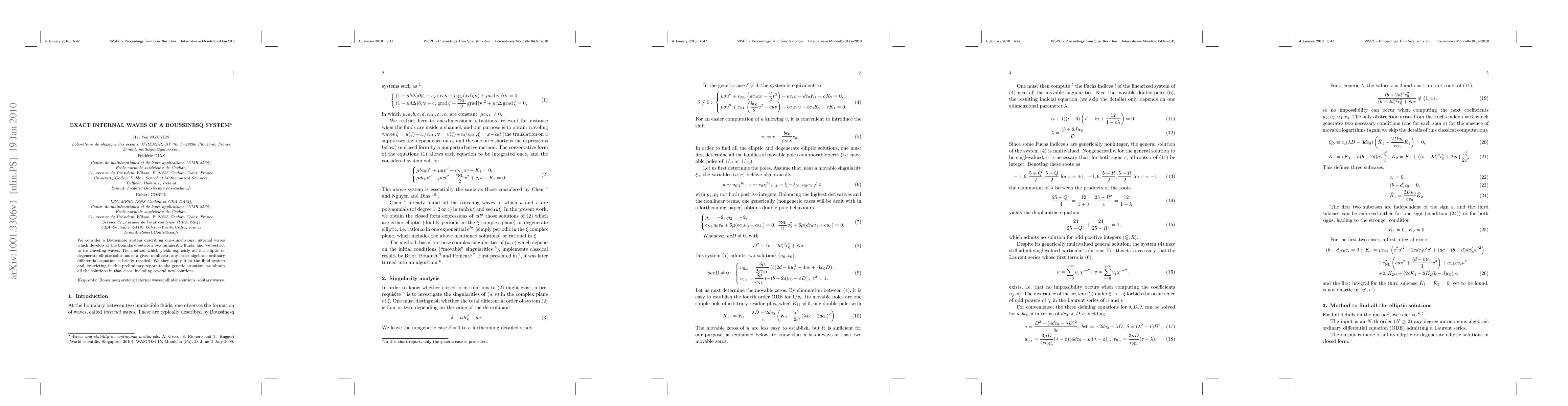 We consider a Boussinesq system describing one-dimensional internal waves which develop at the boundary between two immiscible fluids, and we restrict to its traveling waves. The method which yields explicitly all the elliptic or degenerate elliptic solutions of a given nonlinear, any order algebraic ordinary differential equation is briefly recalled. We then apply it to the fluid system and, restricting in this preliminary report to the generic situation, we obtain all the solutions in that class, including several new solutions.