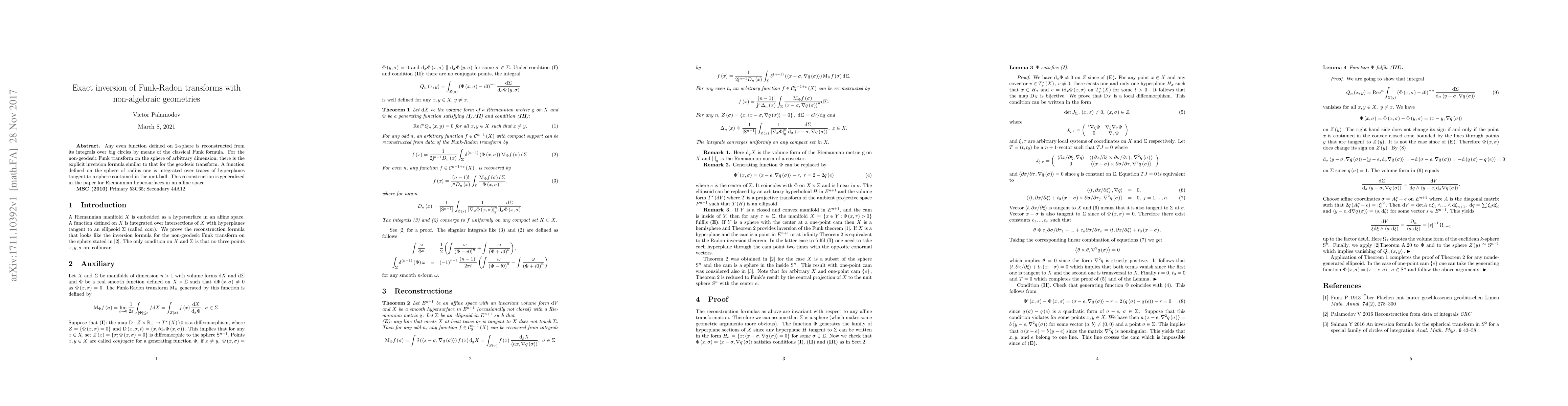 Any even function defined on 2-sphere is reconstructed from its integrals over big circles by means of the classical Funk formula. For the non-geodesic Funk transform on the sphere of arbitrary dimension, there is the explicit inversion formula similar to that for the geodesic transform. A function defined on the sphere of radius one is integrated over traces of hyperplanes tangent to a sphere contained in the unit ball. This reconstruction is generalized in the paper for Riemannian hypersurfaces in an affine space.