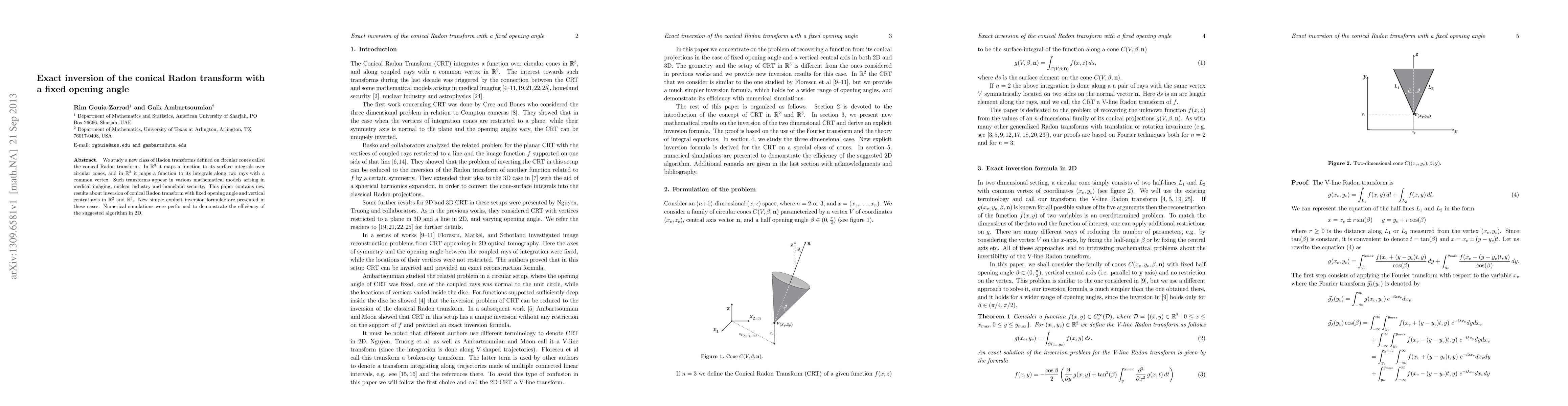 This paper introduces a new class of conical Radon transforms and presents explicit inversion formulae for the transform with fixed opening angle in $\mathbb{R}^2$ and $\mathbb{R}^3$. Numerical simulations validate the efficiency of the proposed inversion algorithm in 2D applications.