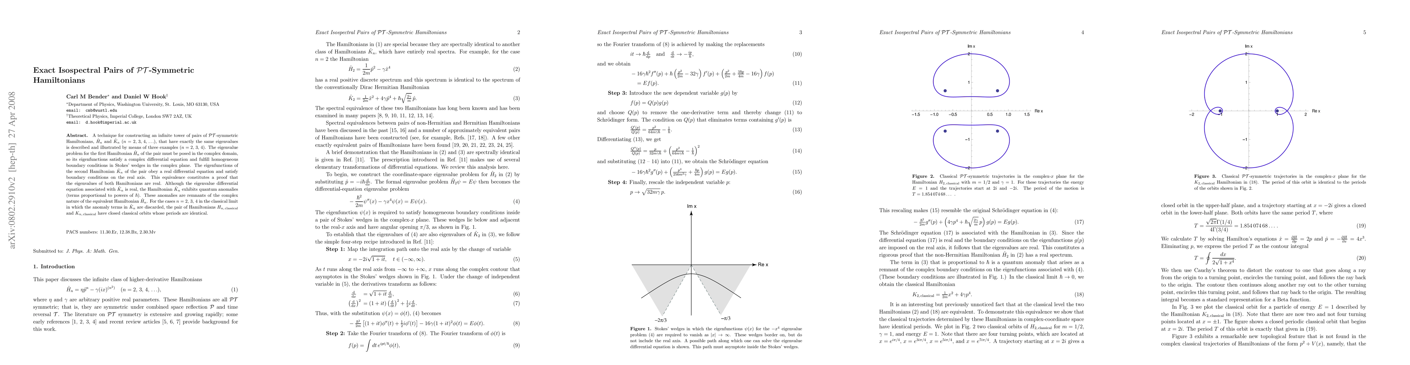 A technique for constructing an infinite tower of pairs of PT-symmetric Hamiltonians, $\hat{H}_n$ and $\hat{K}_n$ (n=2,3,4,...), that have exactly the same eigenvalues is described. The eigenvalue problem for the first Hamiltonian $\hat{H}_n$ of the pair must be posed in the complex domain, so its eigenfunctions satisfy a complex differential equation and fulfill homogeneous boundary conditions in Stokes' wedges in the complex plane. The eigenfunctions of the second Hamiltonian $\hat{K}_n$ of the pair obey a real differential equation and satisfy boundary conditions on the real axis. This equivalence constitutes a proof that the eigenvalues of both Hamiltonians are real. Although the eigenvalue differential equation associated with $\hat{K}_n$ is real, the Hamiltonian $\hat{K}_n$ exhibits quantum anomalies (terms proportional to powers of $\hbar$). These anomalies are remnants of the complex nature of the equivalent Hamiltonian $\hat{H}_n$. In the classical limit in which the anomaly terms in $\hat{K}_n$ are discarded, the pair of Hamiltonians $H_{n,classical}$ and $K_{n,classical}$ have closed classical orbits whose periods are identical.