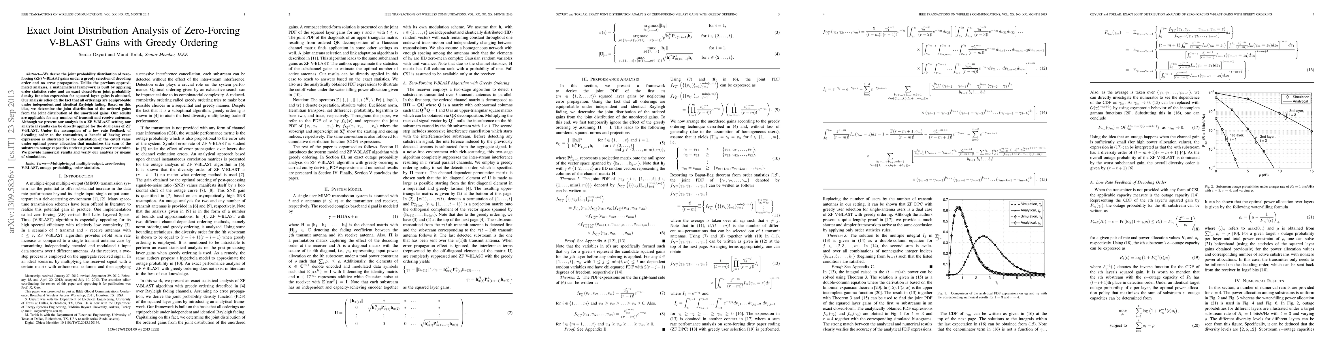 We derive the joint probability distribution of zero-forcing (ZF) V-BLAST gains under a greedy selection of decoding order and no error propagation. Unlike the previous approximated analyses, a mathematical framework is built by applying order statistics rules and an exact closed-form joint probability density function expression for squared layer gains is obtained. Our analysis relies on the fact that all orderings are equiprobable under independent and identical Rayleigh fading. Based on this idea, we determine the joint distribution of the ordered gains from the joint distribution of the unordered gains. Our results are applicable for any number of transmit and receive antennas. Although we present our analysis in a ZF V-BLAST setting, our analytical results can be directly applied for the dual cases of ZF V-BLAST. Under the assumption of a low rate feedback of decoding order to the transmitter, a benefit of having exact expressions is illustrated by the calculation of the cutoff value under optimal power allocation that maximizes the sum of the substream outage capacities under a given sum power constraint. We provide numerical results and verify our analysis by means of simulations.