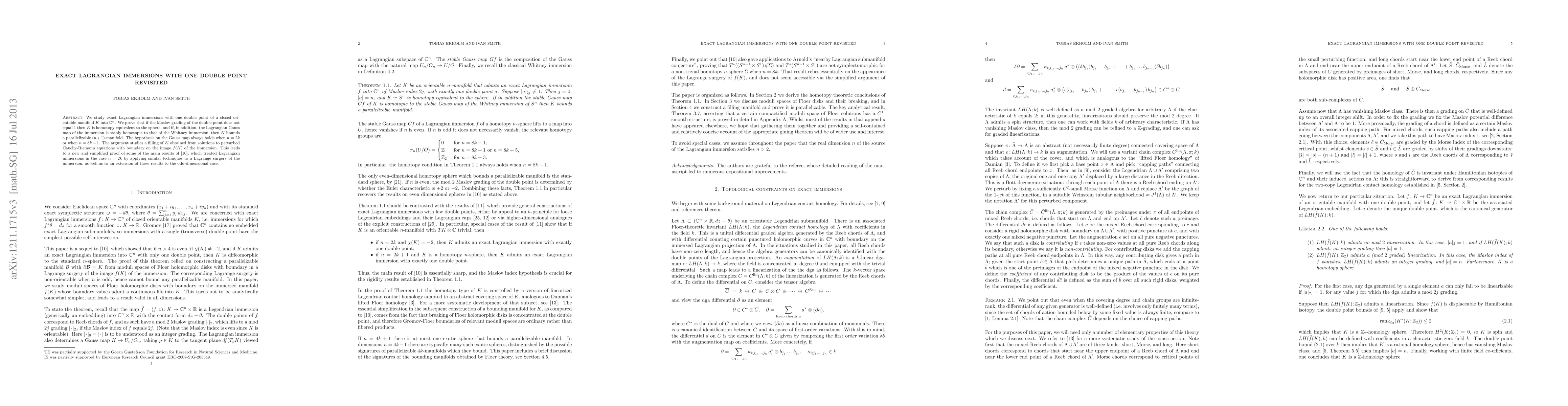 This paper revisits exact Lagrangian immersions with one double point, proving that if the Maslov grading of the double point is not 1, the manifold K is homotopy equivalent to a sphere. Further, if the Lagrangian Gauss map is stably homotopic to the Whitney immersion, K bounds a parallelizable (n+1)-manifold. The study utilizes perturbed Cauchy-Riemann equations to simplify and extend previous results.