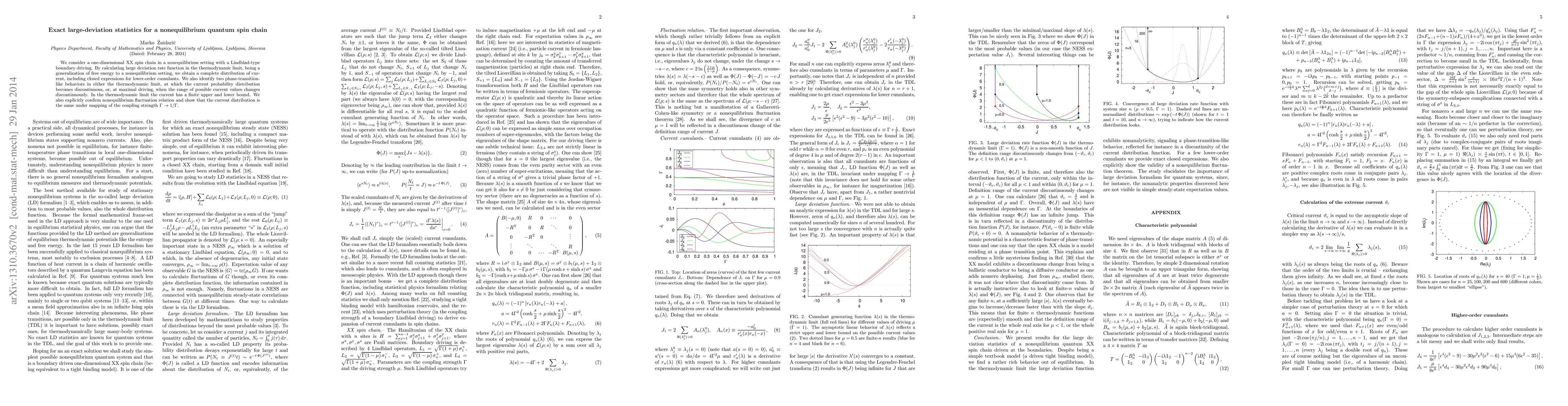 A research paper calculates large deviation statistics for a nonequilibrium quantum spin chain, revealing phase-transition-like behaviors and identifying the current probability distribution in the thermodynamic limit.