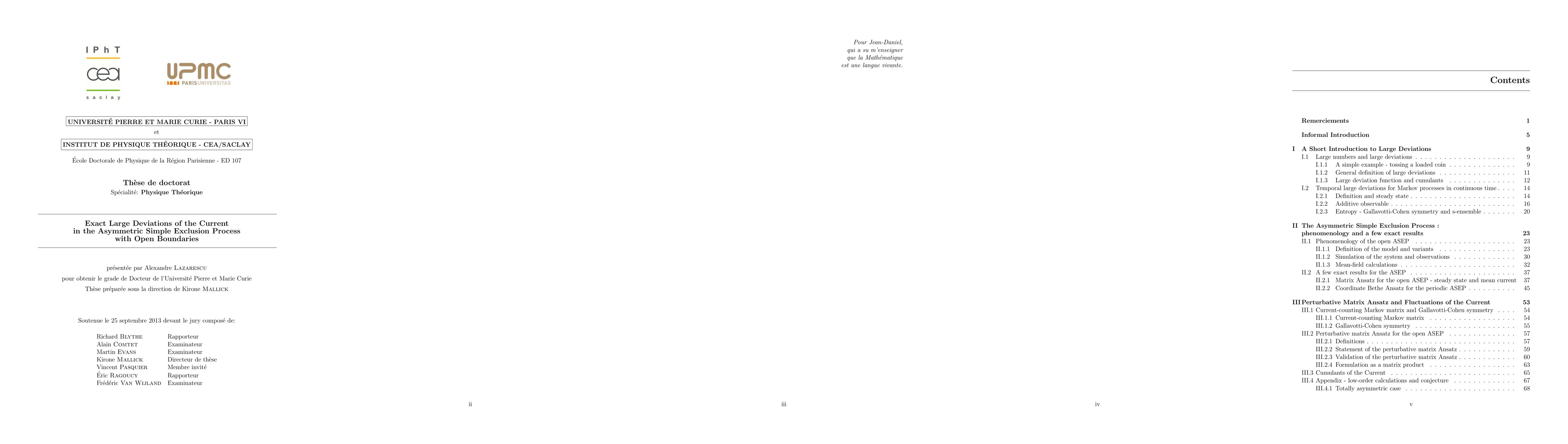 This research paper develops a method to calculate exact large deviations of the current in an asymmetric simple exclusion process with open boundaries, gaining insights into its phase diagram and relation to the algebraic Bethe Ansatz.