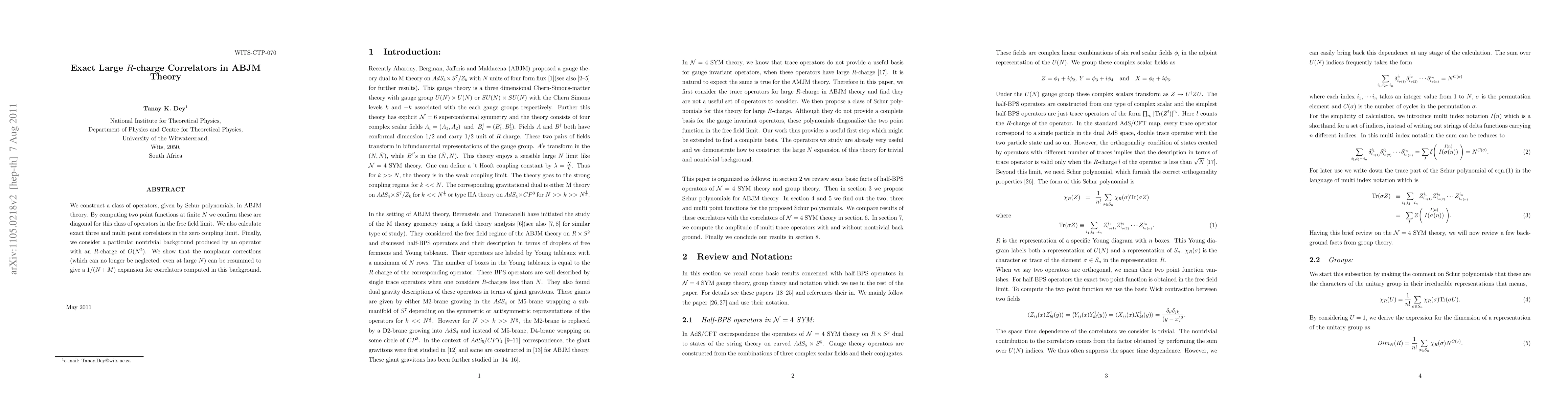 This paper constructs Schur polynomial operators in ABJM theory and confirms their diagonal nature in two-point functions at finite N. It also calculates exact three and multi-point correlators in the zero coupling limit and shows that nonplanar corrections in a specific nontrivial background can be resummed to provide a $1/(N+M)$ expansion.