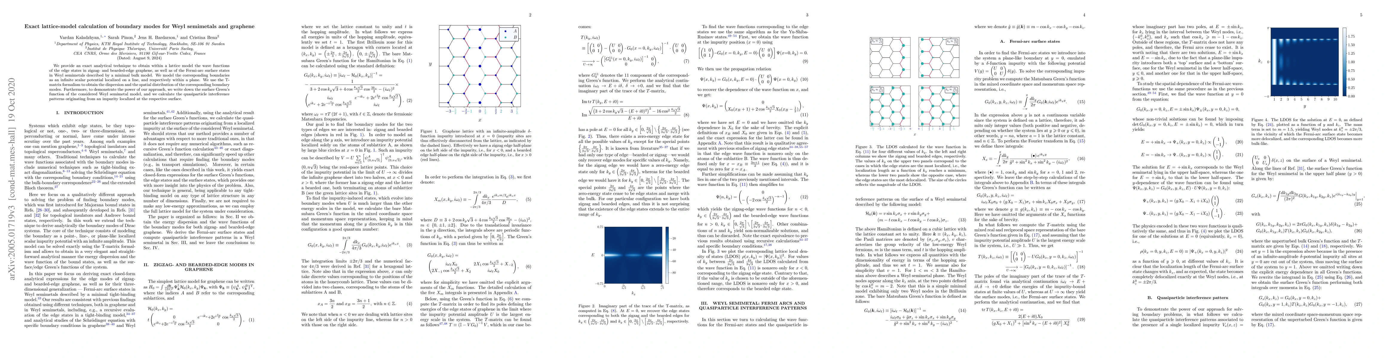 This paper presents an exact analytical method to determine the wave functions of edge states in graphene and Fermi-arc surface states in Weyl semimetals using a lattice model. The T-matrix formalism is employed to analyze the dispersion and spatial distribution of these boundary modes, and quasiparticle interference patterns from surface impurities are calculated.