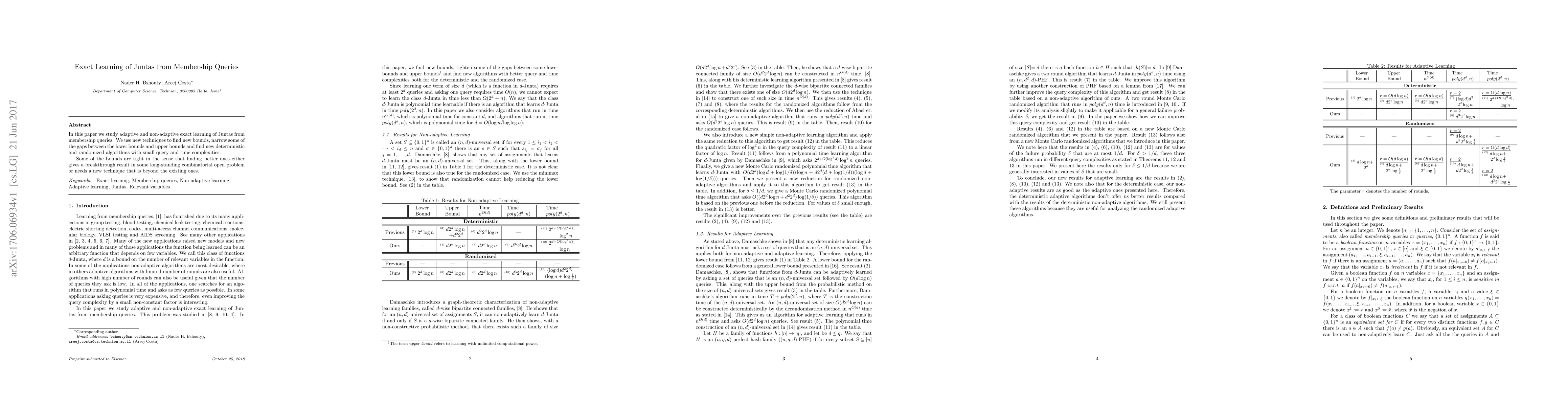This paper investigates adaptive and non-adaptive exact learning of Juntas using membership queries, presenting new bounds and algorithms with improved query and time complexities, while highlighting some bounds as potentially tight.