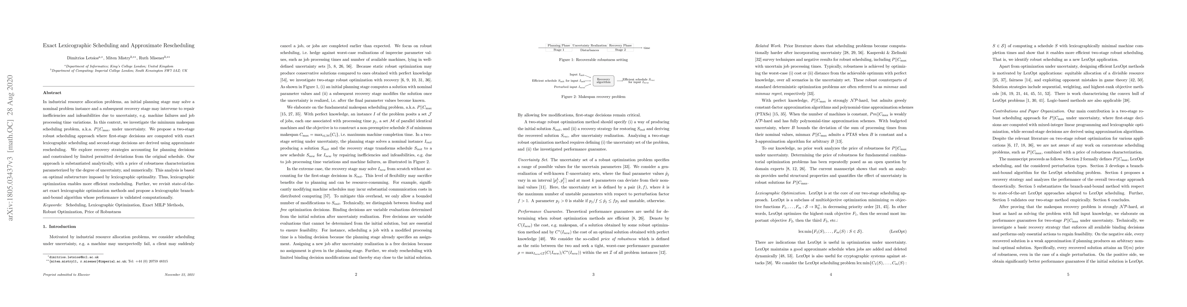 This paper explores robust scheduling strategies for minimizing makespan in industrial resource allocation under uncertainty, proposing a two-stage approach combining exact lexicographic scheduling and approximate rescheduling for recovery. The study introduces a lexicographic branch-and-bound algorithm and validates its efficiency through analytical and numerical analysis.