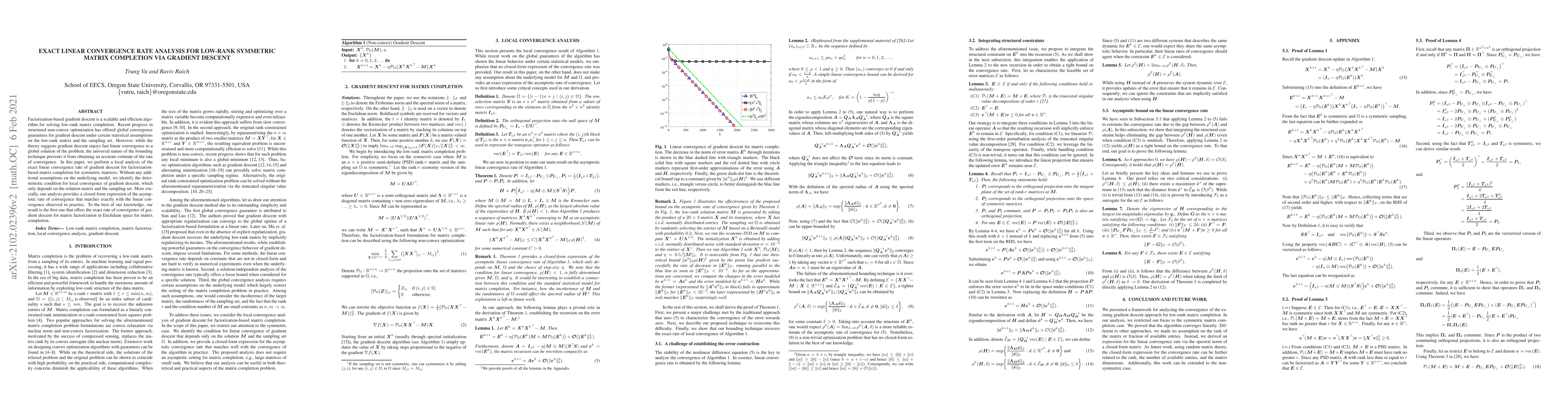This paper analyzes the exact linear convergence rate of gradient descent for low-rank symmetric matrix completion, providing a closed-form expression that matches the observed linear convergence in practice. It identifies deterministic conditions for convergence without additional assumptions, offering the first exact rate of convergence for matrix factorization in this context.