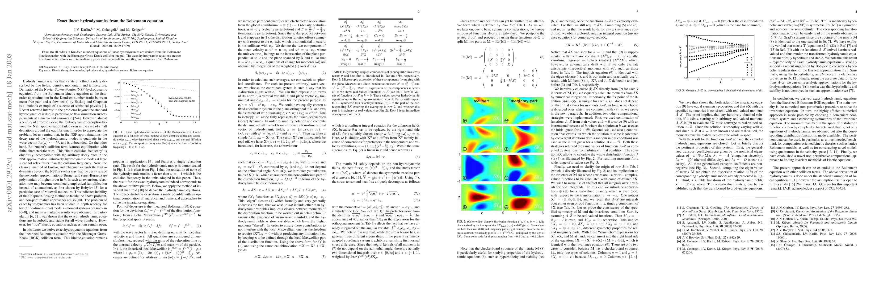 This paper derives exact linear hydrodynamic equations from the Boltzmann equation using the Bhatnagar-Gross-Krook collision model, proving their hyperbolicity, stability, and the existence of an H-theorem. The approach is valid to all orders in the Knudsen number.