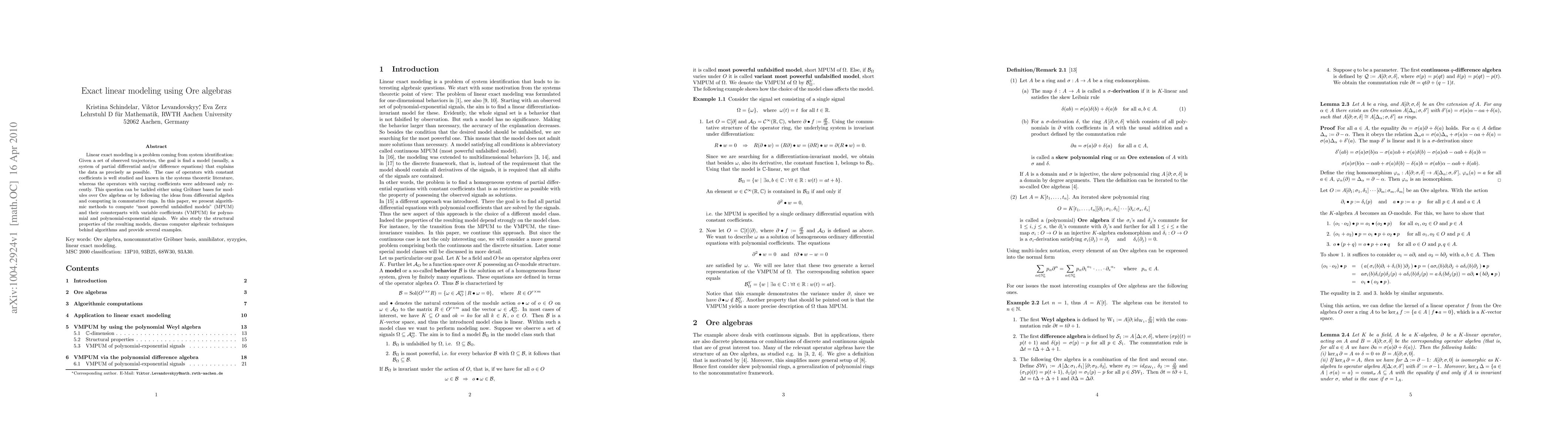 Linear exact modeling is a problem coming from system identification: Given a set of observed trajectories, the goal is find a model (usually, a system of partial differential and/or difference equations) that explains the data as precisely as possible. The case of operators with constant coefficients is well studied and known in the systems theoretic literature, whereas the operators with varying coefficients were addressed only recently. This question can be tackled either using Gr\"obner bases for modules over Ore algebras or by following the ideas from differential algebra and computing in commutative rings. In this paper, we present algorithmic methods to compute "most powerful unfalsified models" (MPUM) and their counterparts with variable coefficients (VMPUM) for polynomial and polynomial-exponential signals. We also study the structural properties of the resulting models, discuss computer algebraic techniques behind algorithms and provide several examples.