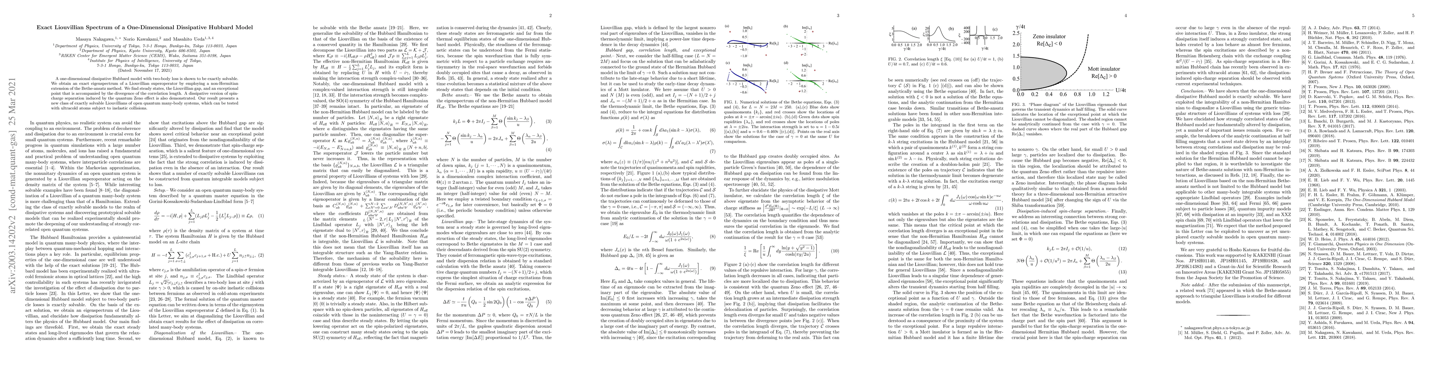 This paper presents an exact solution for the Liouvillian spectrum of a one-dimensional dissipative Hubbard model using a non-Hermitian Bethe-ansatz method, revealing steady states, a Liouvillian gap, and an exceptional point linked to a divergence in correlation length, alongside demonstrating a quantum Zeno-induced spin-charge separation. This work introduces a new class of solvable Liouvillians for open quantum systems.