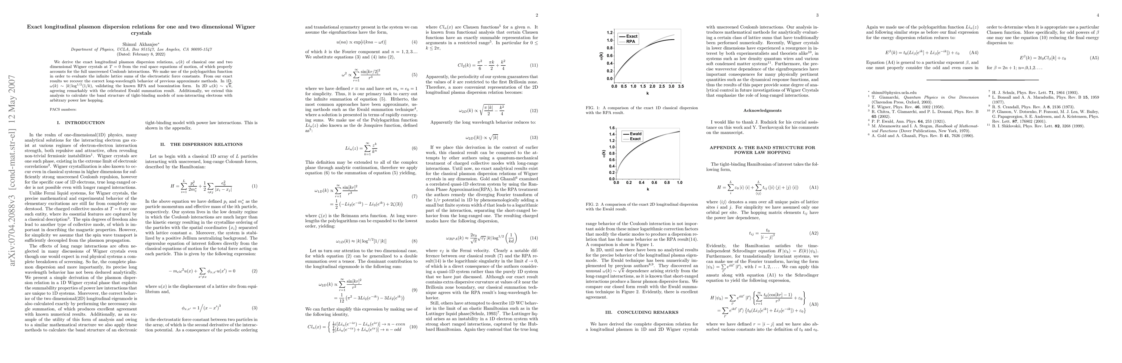 Researchers derive exact dispersion relations for one- and two-dimensional Wigner crystals, recovering known results and validating bosonization form in 1D, while agreeing with Ewald summation result in 2D.