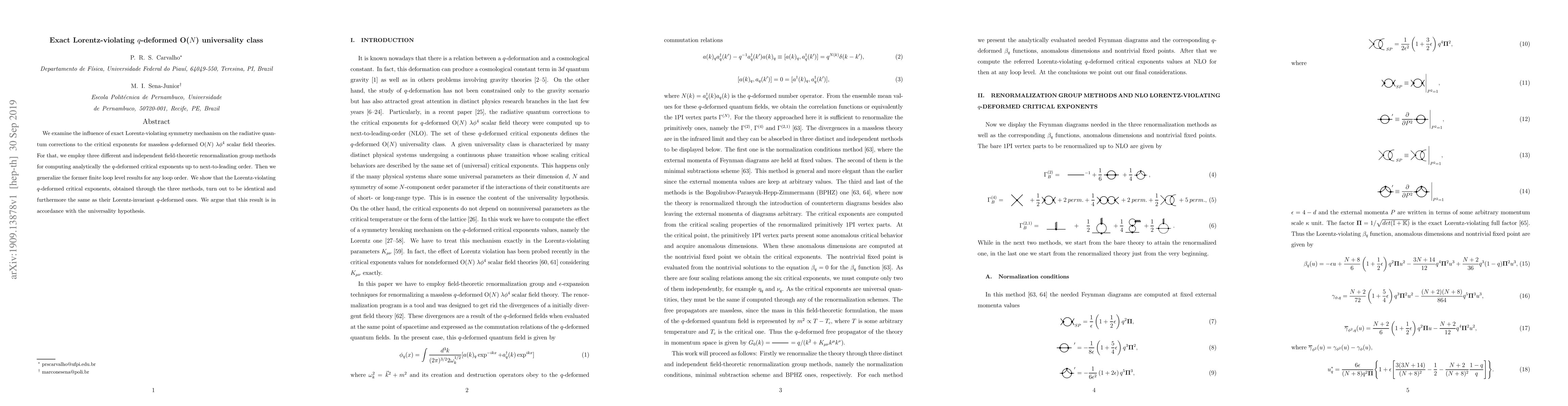 We examine the influence of exact Lorentz-violating symmetry mechanism on the radiative quantum corrections to the critical exponents for massless $q$-deformed O($N$) $\lambda\phi^{4}$ scalar field theories. For that, we employ three different and independent field-theoretic renormalization group methods for computing analytically the $q$-deformed critical exponents up to next-to-leading order. Then we generalize the former finite loop level results for any loop order. We show that the Lorentz-violating $q$-deformed critical exponents, obtained through the three methods, turn out to be identical and furthermore the same as their Lorentz-invariant $q$-deformed ones. We argue that this result is in accordance with the universality hypothesis.