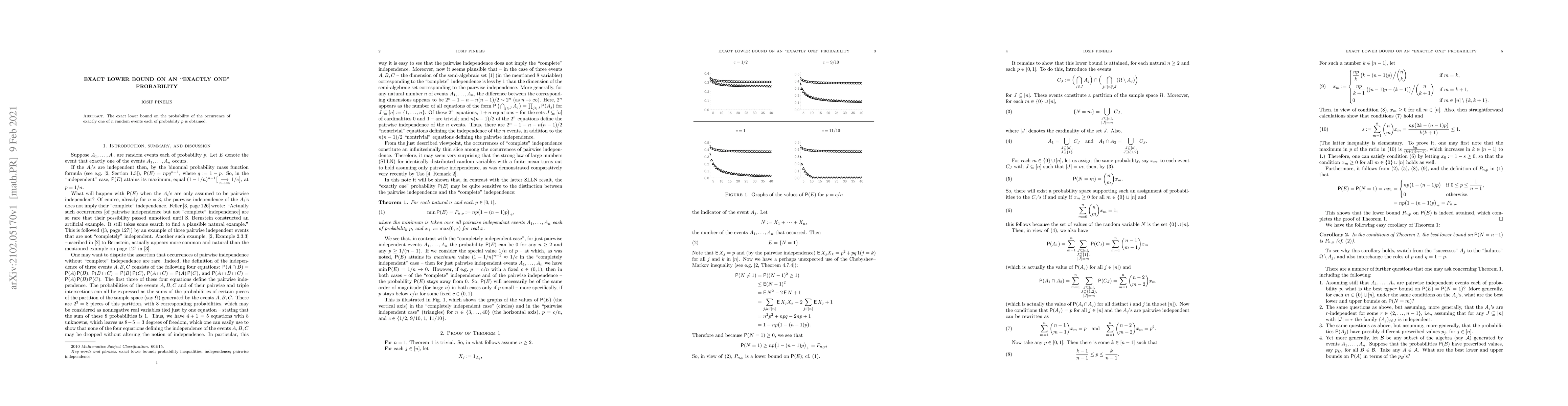 The exact lower bound on the probability of the occurrence of exactly one of $n$ random events each of probability $p$ is obtained.