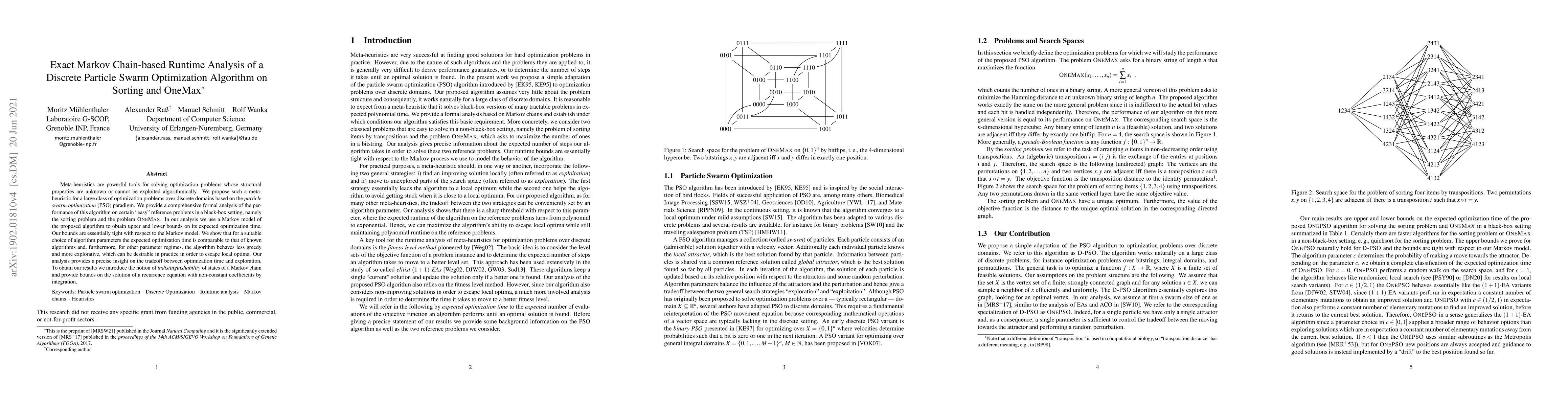 A new meta-heuristic algorithm based on particle swarm optimization is analyzed for its runtime performance on sorting and OneMax problems. The analysis shows that the algorithm can achieve comparable results to known algorithms with suitable parameters, while also behaving more exploratory in other regimes.