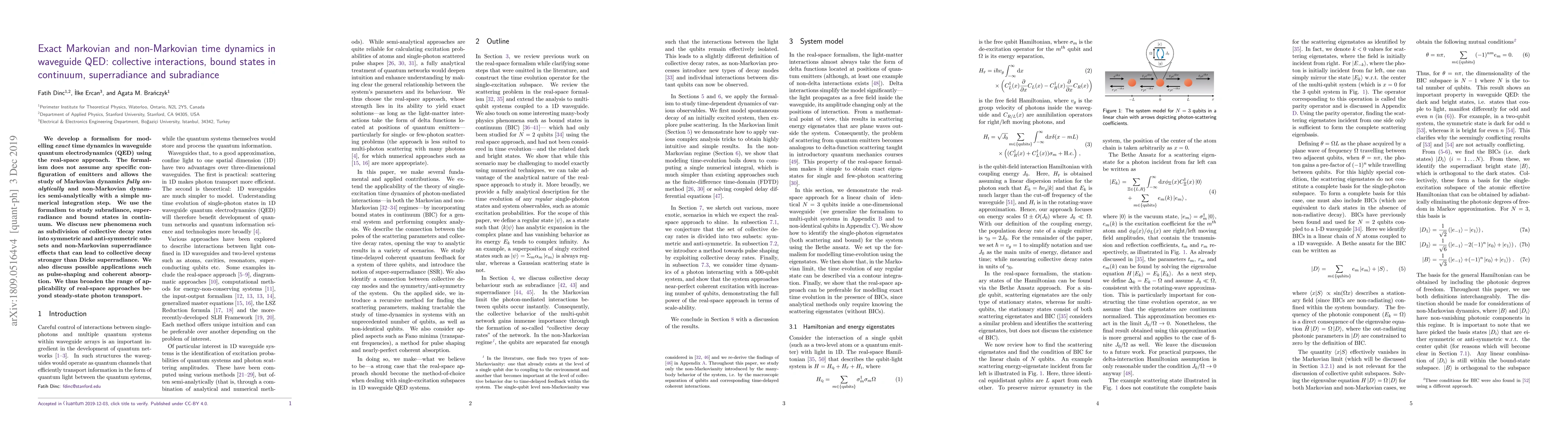 This paper develops a formalism for exact time dynamics in waveguide QED, enabling fully analytical treatment of Markovian and semi-analytical with numerical integration for non-Markovian dynamics. It explores phenomena like subradiance, superradiance, and bound states in continuum, revealing new collective decay dynamics and potential applications in pulse-shaping and coherent absorption.
