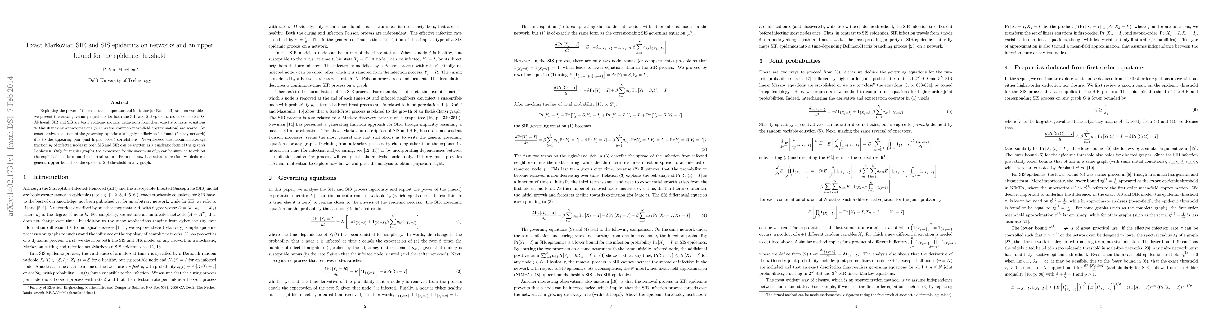 This paper presents exact equations for SIR and SIS epidemic models on networks without approximations, deriving an upper bound for the epidemic threshold using the graph's Laplacian and spectral radius for regular graphs.