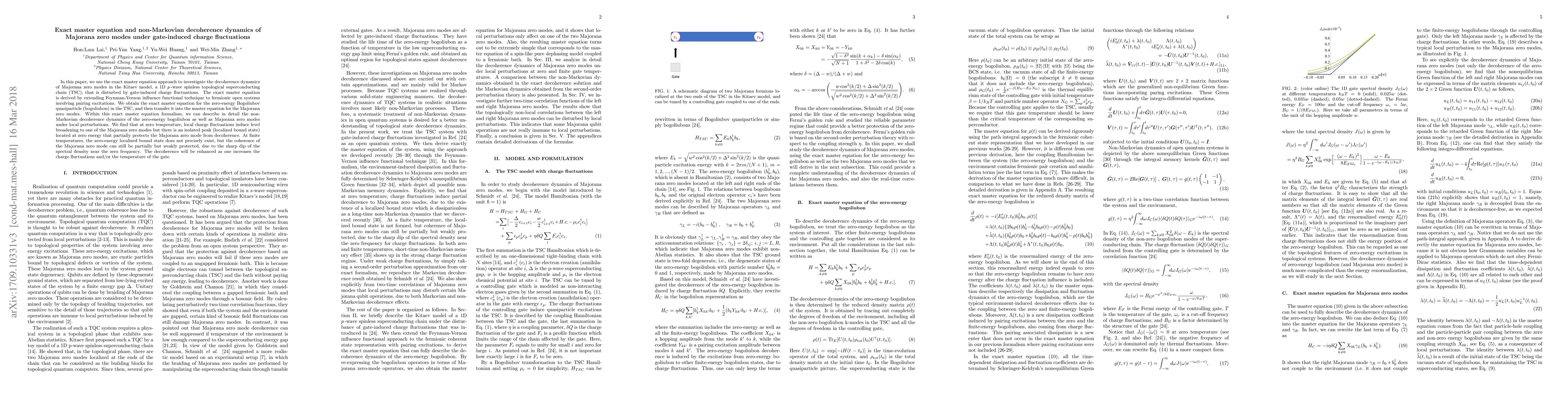 This paper derives an exact master equation to study the decoherence dynamics of Majorana zero modes in a 1D topological superconducting chain under gate-induced charge fluctuations. It reveals that at zero temperature, a zero-energy localized bound state protects Majorana modes from decoherence, but finite temperatures prevent this state formation, leading to inevitable decoherence.