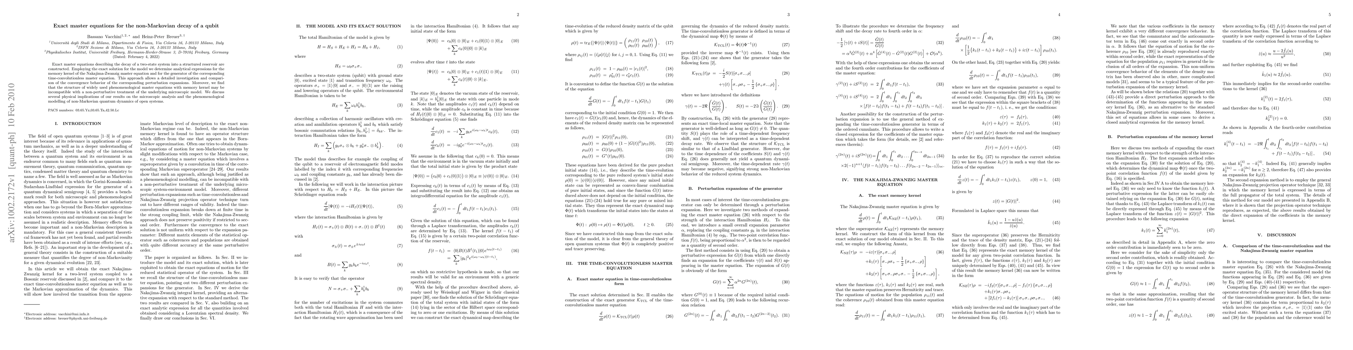 This paper constructs exact master equations for the non-Markovian decay of a qubit into a structured reservoir, providing analytical expressions for memory kernels and examining the convergence of perturbation expansions. It reveals that traditional phenomenological master equations may not align with a non-perturbative microscopic model, with implications for both theoretical analysis and modeling of non-Markovian quantum dynamics.