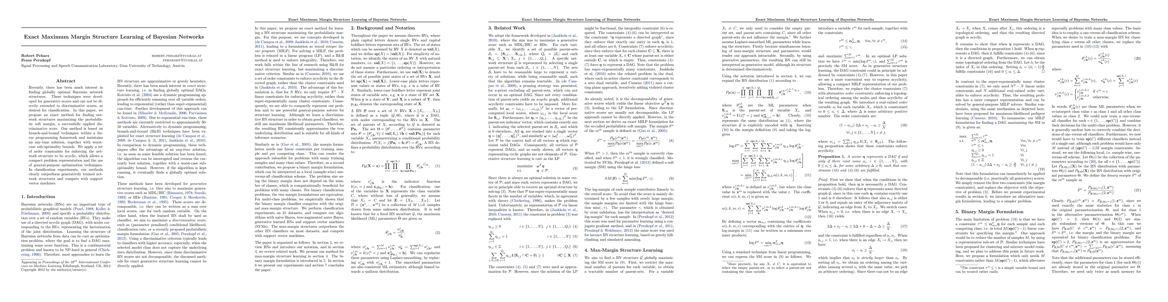 This paper proposes an exact method for learning Bayesian network structures that maximize the probabilistic soft margin, a discriminative score for classification. The method employs branch-and-bound within a linear programming framework, ensuring any-time solutions and sub-optimality bounds, and enforces acyclicity through order constraints. Experimental results show superior performance compared to generatively trained networks and competitive results against support vector machines.
